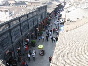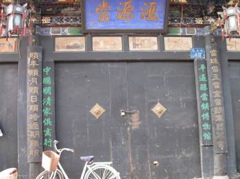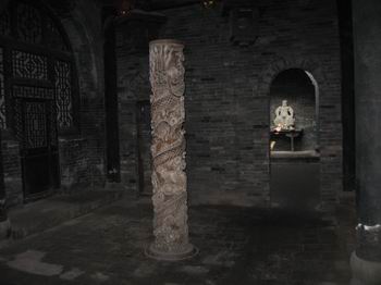 平遙古城內(nèi)的景點(diǎn)比較多的是票號(hào),十八個(gè)景點(diǎn)我們只去了十個(gè),其他的都是票號(hào)和鏢局,內(nèi)部擺設(shè)大同小異。票號(hào)始祖“日升昌”當(dāng)然是非去不可的,除了建筑外觀與現(xiàn)代銀行不一樣外,內(nèi)部機(jī)構(gòu)設(shè)置簡(jiǎn)直就是現(xiàn)代銀行的翻版。當(dāng)然,這種說(shuō)法應(yīng)該反過(guò)來(lái),現(xiàn)代銀行是無(wú)數(shù)個(gè)“日升昌”的翻版。還有“協(xié)同慶票號(hào)”,以其巨大的地下金庫(kù)聞名,它地下的部分和地上的部分是一樣大面積,從隱蔽的入口沿石階小心走下去,好似進(jìn)入一個(gè)大天井,天井四周是一扇扇小門(mén),里面就是堆放真金白銀的小倉(cāng)庫(kù)。天井正中一根盤(pán)龍石柱,高約二人,粗有半米,一條龍完整的沿柱子盤(pán)旋上升,雕工細(xì)致而不繁瑣,這在平遙是很少見(jiàn)的雕工。在一家票號(hào)內(nèi)我們還見(jiàn)到了接待客人的地方擺著一張煙塌,在票號(hào),抽大煙是嚴(yán)禁的。這張煙塌設(shè)在談判的房間,可見(jiàn)是專(zhuān)門(mén)用于接待客人的,有些類(lèi)似于現(xiàn)代的請(qǐng)客吃飯洗桑拿。至于鏢局,當(dāng)然是和票號(hào)同生共長(zhǎng)的行業(yè)。內(nèi)部迎面一排武器架,大刀鐵錘的雖不至于十八般兵器全了,不過(guò)也挺震撼的。幾乎每個(gè)鏢局院內(nèi)都有一個(gè)大約一米的石頭元寶,意為招財(cái)進(jìn)寶。