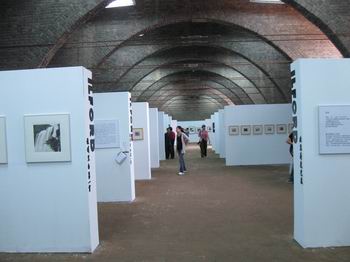 吃罷早飯,來(lái)到離西門(mén)最近的展區(qū),開(kāi)始此行最主要的目的――觀展。平遙國(guó)際攝影節(jié)是世界最大規(guī)模最高規(guī)格的攝影節(jié),來(lái)自世界各地的名家作品都將在這里參展,當(dāng)然,也有來(lái)自全國(guó)各地各門(mén)各派甚至個(gè)人參展。攝影節(jié)其間,整個(gè)平遙都是一個(gè)大展臺(tái),比較集中的幾個(gè)地方有柴油機(jī)廠、土倉(cāng)(土產(chǎn)倉(cāng)庫(kù))、二針、城隍廟、縣衙、棉織廠和文廟。其中土倉(cāng)的作品規(guī)格較高,世界級(jí)的大師主要集中在那里。縣衙的展品主要體現(xiàn)“奧運(yùn)?大愛(ài)”這個(gè)主題,主要作品為奧運(yùn)、圖片和地震相關(guān)圖片,還有土耳其、印度等風(fēng)光照。柴油機(jī)廠主要是國(guó)內(nèi)比較知名攝影家作品的集中地。二針是學(xué)生作品。棉織廠主要是來(lái)自五湖四海的較有個(gè)性的新銳攝影師的個(gè)人展覽,作品比較出奇,以玩創(chuàng)意為主。因?yàn)橛袀€(gè)朋友在棉織廠辦個(gè)展,所以我們先從這里看起,因此整個(gè)國(guó)際攝影節(jié)給我留下的第一印象是:水平?jīng)]有我想象般高。滿倉(cāng)滿谷的照片看得我神經(jīng)麻木,身邊到處是掛著長(zhǎng)槍短炮的人們,到處是“咔嚓咔嚓”的快門(mén)聲,幸好科技進(jìn)步到數(shù)碼時(shí)代,如果是膠片拍攝,估計(jì)這些人們就不會(huì)這么大方了。于是準(zhǔn)備去城墻上轉(zhuǎn)轉(zhuǎn),感受一下居高臨下憑風(fēng)而立俯視全城的愜意。