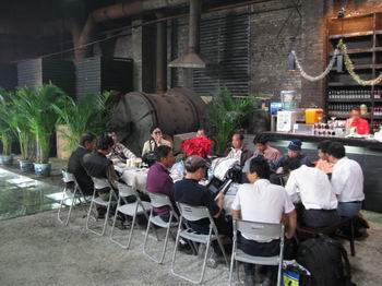 在柴油機(jī)廠展區(qū)的作品是比較知名的攝影家的作品,以風(fēng)景照居多,還有人物特寫(xiě)。柴油機(jī)廠展區(qū)的作品都是因地制宜擺放,一臺(tái)臺(tái)油乎乎的機(jī)床上面這兒擺一幅那里擺一幅,全非一般展覽那種正經(jīng)八百的布展方式。然而這種奇特的結(jié)合在這座古城竟然讓人感覺(jué)很正常,似乎天生就應(yīng)該是這樣子的。崎嶇不平的土路并不好走,那天天氣還非常炎熱,是我們?cè)谏轿鬟@五天內(nèi)最炎熱的一天。在柴油機(jī)場(chǎng)最里側(cè)有一家很著名的平遙酒吧。酒吧外是汾酒搭建的一個(gè)大棚做促銷(xiāo),小瓶裝竹葉青才五元一瓶,不愧是原產(chǎn)地,就是便宜,在外地都要賣(mài)到十四一瓶。酒吧內(nèi)沒(méi)有任何裝飾,就是利用柴油機(jī)廠的一間廠房改造而成,屋頂?shù)醯暮芨?,南面的墻上兩人高的地方是一排?lèi)似百葉窗的木窗子,酒吧內(nèi)黑乎乎的,光線透過(guò)窗外斑駁的樹(shù)葉射進(jìn)室內(nèi),一縷縷陽(yáng)光就像紡紗的絲線,縷縷清晰可見(jiàn),真是說(shuō)不出的藝術(shù)感,吸引了很多人端著相機(jī)一陣狂拍。