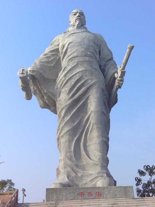 辛棄疾深度游則是出自先生,他是辛棄疾終級(jí)粉絲,這次出行本沒打算去鉛山,是準(zhǔn)備去三清山的,沒想到變成對(duì)他的生活足跡的追隨游。我們看了鉛山縣的辛棄疾巨型雕塑,足有32.5米高,建在一座小山上,面山背海,巍峨無(wú)比,辛棄疾雕像高大威猛,儒雅俊朗,左手持劍右手持書眼望北方,那是對(duì)一生為之付出的“醉里挑燈看劍,夢(mèng)回吹角連營(yíng)”對(duì)陣金國(guó)復(fù)國(guó)夢(mèng)的一生寫照啊。我們又千辛萬(wàn)苦的找到“稼軒鄉(xiāng)”,并打聽到墓地舊址,一路尋去。山中車行六七公里,最后一段須棄車步行上山,墓地冷冷清清,環(huán)境倒是群山環(huán)抱極為清YOU,據(jù)說他自己選取的墓地,我一陣難過,辛棄疾一生抗金,出生在濟(jì)南卻客死他鄉(xiāng)且終生不能返鄉(xiāng),因濟(jì)南是“敵占區(qū)”,抱負(fù)不能實(shí)現(xiàn),終日避居“瓢泉?jiǎng)e墅”基本過著隱居生活終老于此。先生還不過癮,直呼要再來此地,遍訪當(dāng)年辛棄疾鉛山所寫詩(shī)詞發(fā)生地,踏遍鉛山尋訪。
