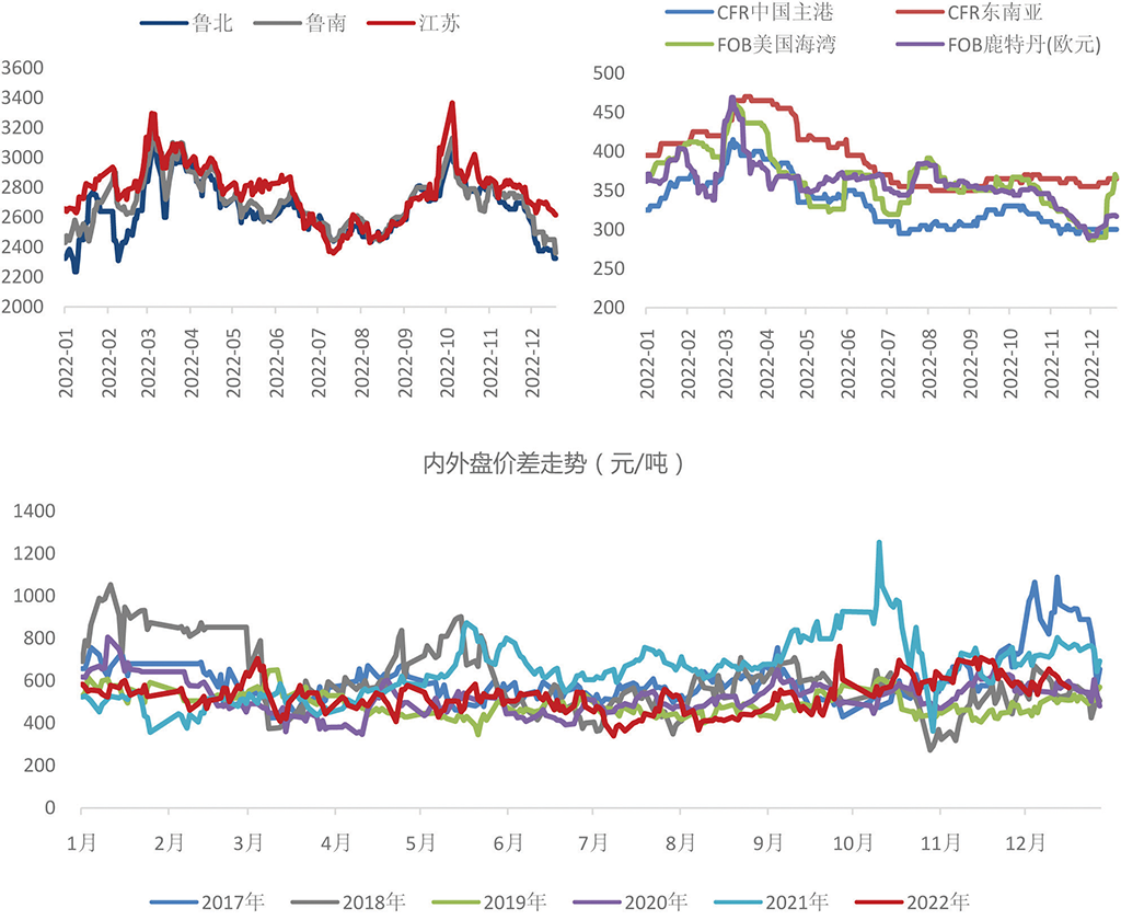 現(xiàn)貨方面,從國內(nèi)來看,去年年內(nèi)2次出現(xiàn)港口價格低于內(nèi)陸(魯南&魯北)的異?,F(xiàn)象,引發(fā)港口貨回流內(nèi)陸,分別在7月份和9月份,對應(yīng)的分別是6月份超跌反彈和年內(nèi)“金九銀十”;從國際來看,因?yàn)蹩颂m危機(jī)的緣故,2022年全球天然氣市場大幅波動,引發(fā)歐美市場甲醇(氣制)振幅顯著擴(kuò)大。FOB鹿特丹價格波動顯然比其余港口到港價波動要更為劇烈。