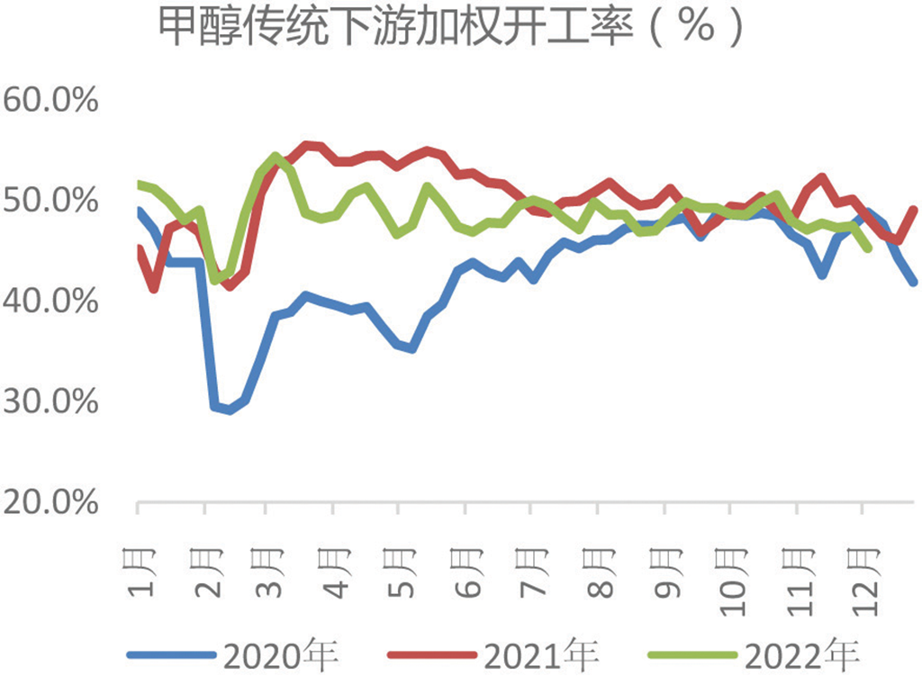 去年2月份和8月份開工率顯著降低,前者受春節(jié)影響,甲醛等裝置停車檢修較多,同時醋酸、MTO負(fù)荷有所降低,影響甲醇消費(fèi);對后者而言,隨著南京誠志一期、浙江興興、神華新疆、延長中煤及魯西化工等MTO裝置的停車,8月份甲醇消費(fèi)量大幅縮減,另外疫情頻發(fā)拖累整個宏觀經(jīng)濟(jì)及下游消費(fèi)。