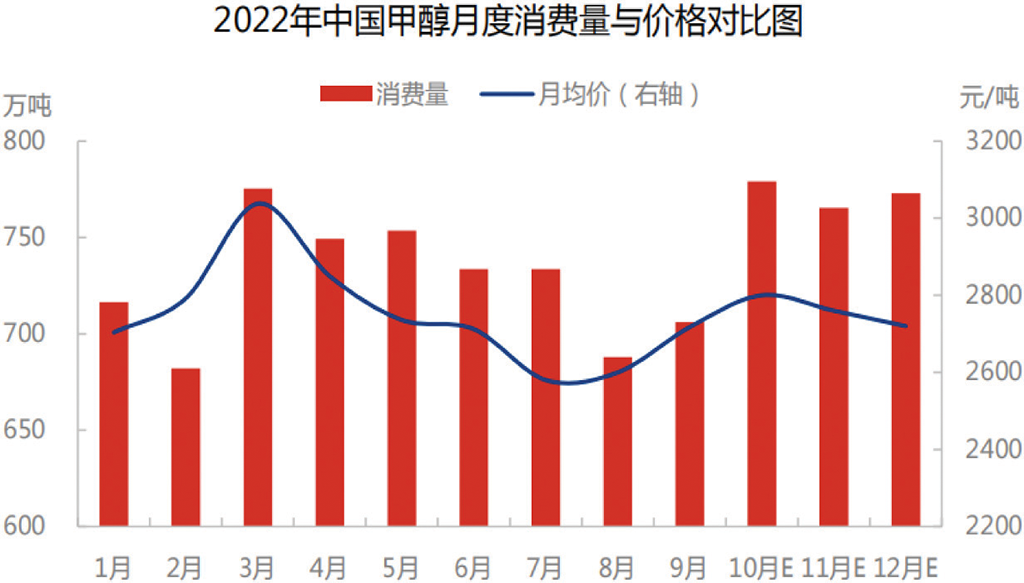 再看下游需求。2022年中國甲醇消費(fèi)總量在8855.25萬噸,增速有所放緩,較上年上漲7.7%。從月度消費(fèi)情況來看,甲醇消費(fèi)量及下游開工率呈現(xiàn)先增后減再增的趨勢,與價格相關(guān)性較強(qiáng)。