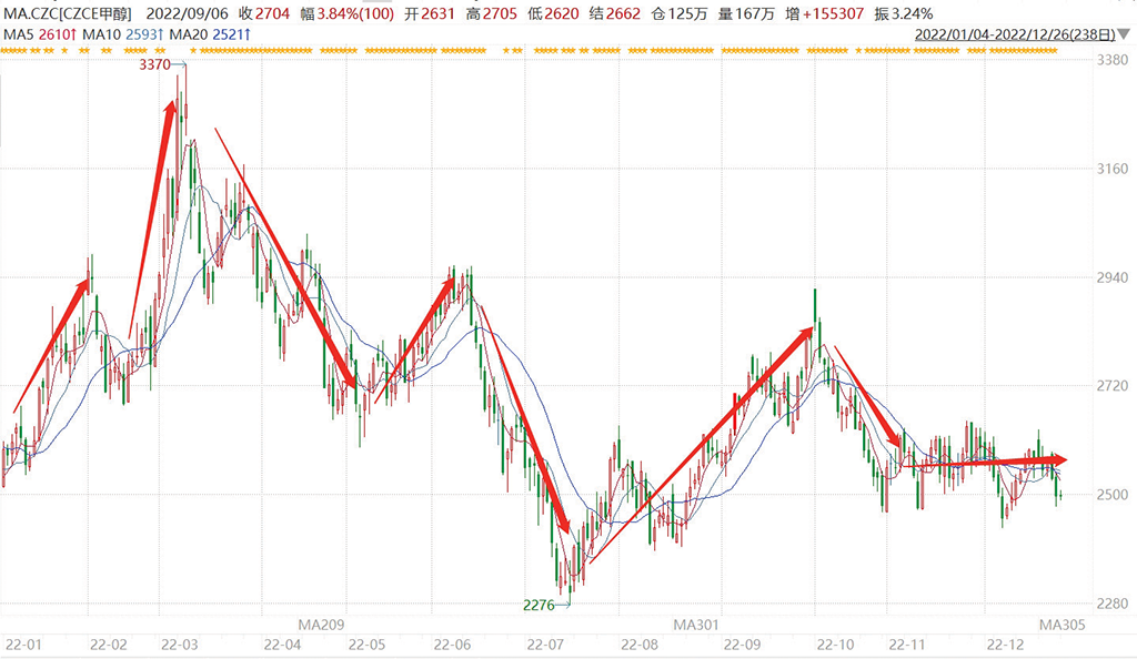 自去年6月中旬起,美聯(lián)儲超預(yù)期加息,國內(nèi)商品再次破位下行,甲醇期現(xiàn)貨亦同步坍塌式大跌,期貨主力最低降至2276點(diǎn),較3月9日跌幅超過30%,市場對經(jīng)濟(jì)下滑及需求不振擔(dān)憂顯著。8月起在國內(nèi)甲醇供應(yīng)縮量、運(yùn)輸受限導(dǎo)致進(jìn)口縮量背景下,市場呈現(xiàn)底部反彈行情,且金九銀十傳統(tǒng)旺季背景下市場走出一波較好反彈走勢。