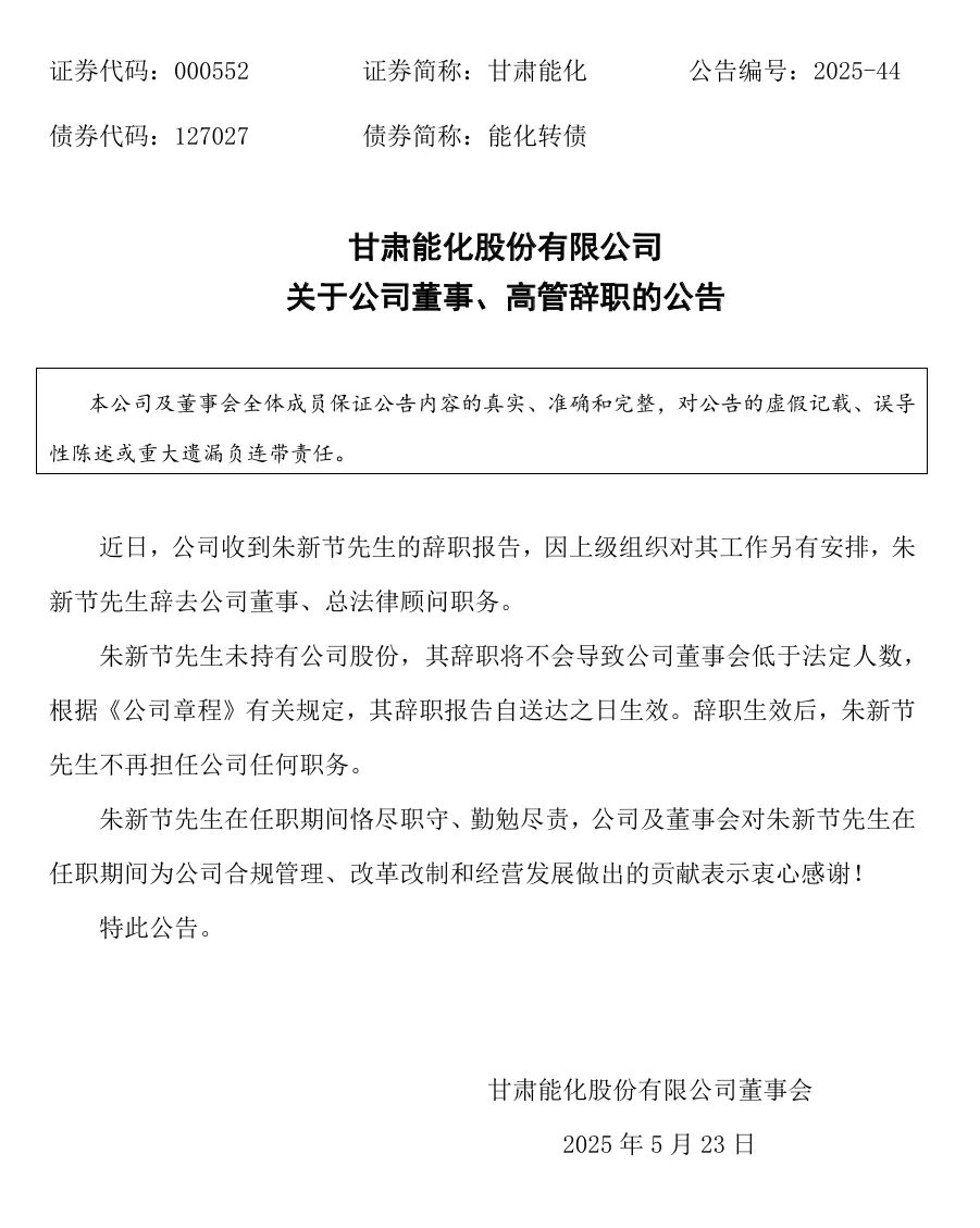 5月23日,甘肅能化發(fā)布公告稱,近日,公司收到朱新節(jié)先生的辭職報(bào)告,因上級(jí)組織對(duì)其工作另有安排,朱新節(jié)先生辭去公司董事、總法律顧問職務(wù)。朱新節(jié)先生未持有公司股份,其辭職將不會(huì)導(dǎo)致公司董事會(huì)低于法定人數(shù),根據(jù)《公司章程》有關(guān)規(guī)定,其辭職報(bào)告自送達(dá)之日生效。辭職生效后,朱新節(jié)先生不再擔(dān)任公司任何職務(wù)。