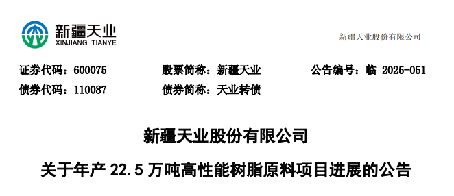 7月17日,新疆天業(yè)發(fā)布公告稱,公司開(kāi)發(fā)行可轉(zhuǎn)換公司債券募集資金投資項(xiàng)目——年產(chǎn)22.5萬(wàn)噸高性能樹(shù)脂原料項(xiàng)目,由公司全資子公司新疆天業(yè)匯祥新材料有限公司建設(shè)實(shí)施,該項(xiàng)目近日成功打通全流程,順利產(chǎn)出高性能樹(shù)脂原料,對(duì)推動(dòng)公司進(jìn)一步實(shí)現(xiàn)綠色低碳可持續(xù)發(fā)展具有重要意義。