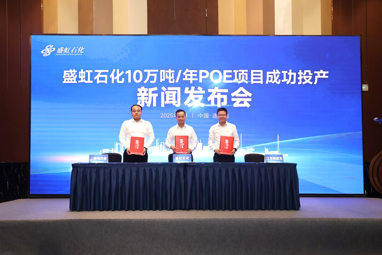 9月4日,盛虹石化10萬噸/年P(guān)OE項目成功投產(chǎn)新聞發(fā)布會暨長期供貨戰(zhàn)略合作簽約儀式在江蘇連云港舉行,首批320噸優(yōu)等產(chǎn)品同步發(fā)車交付。