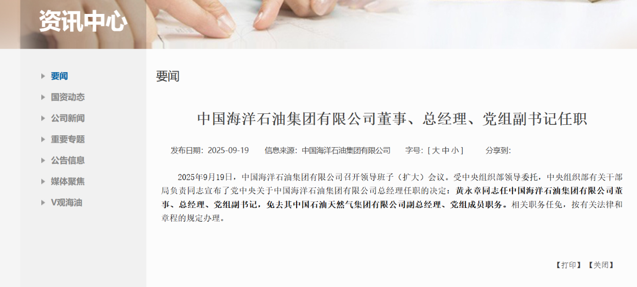 9月19日,中國海洋石油集團(tuán)有限公司(以下簡稱“中海油集團(tuán)”)官網(wǎng)發(fā)布消息稱,在當(dāng)日集團(tuán)舉行的領(lǐng)導(dǎo)班子(擴(kuò)大)會議上,黃永章被任命為任集團(tuán)董事、總經(jīng)理、黨組副書記,同時(shí)免去其中國石油天然氣集團(tuán)有限公司(以下簡稱“中石油集團(tuán)”)副總經(jīng)理、黨組成員職務(wù)。