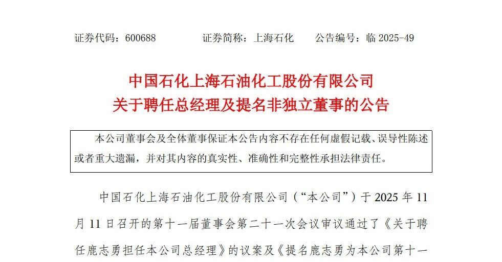 中國(guó)石化上海石油化工股份有限公司(下稱“本公司”)于2025年11月11日召開(kāi)的第十一屆董事會(huì)第二十一次會(huì)議審議通過(guò)了《關(guān)于聘任鹿志勇?lián)伪竟究偨?jīng)理》的議案及《提名鹿志勇為本公司第十一屆董事會(huì)非獨(dú)立董事候選人》的議案。