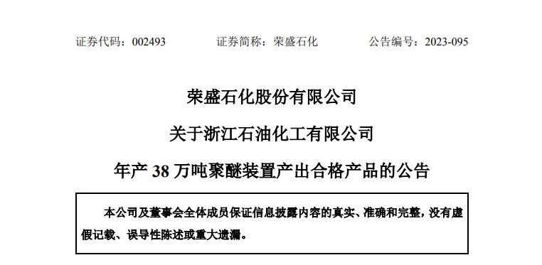 12月19日,榮盛石化發(fā)布關(guān)于浙江石油化工有限公司年產(chǎn)38萬(wàn)噸聚醚裝置產(chǎn)出合格產(chǎn)品的公告。