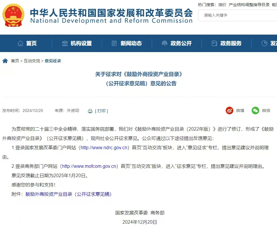 12月20日,國家發(fā)改委官網(wǎng)發(fā)布關于征求對《鼓勵外商投資產(chǎn)業(yè)目錄》(公開征求意見稿)意見的公告。