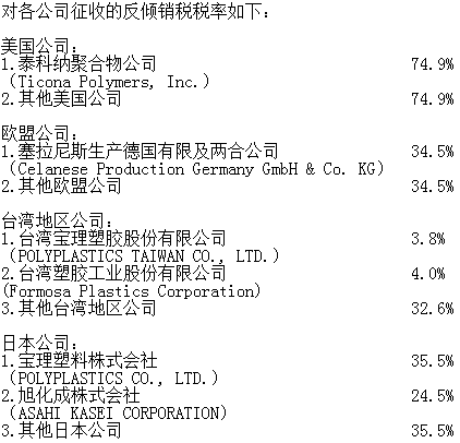 對原產(chǎn)于美國、歐盟、臺灣地區(qū)和日本的進口共聚聚甲醛征收反傾銷稅