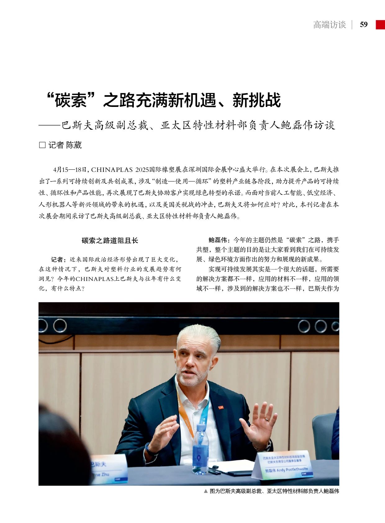 4月15—18日,CHINAPLAS 2025國際橡塑展在深圳國際會展中心盛大舉行。在本次展會上,巴斯夫推出了一系列可持續(xù)創(chuàng)新及共創(chuàng)成果,涉及“制造—使用—循環(huán)”的塑料產(chǎn)業(yè)鏈各階段,助力提升產(chǎn)品的可持續(xù)性、循環(huán)性和產(chǎn)品性能,再次展現(xiàn)了巴斯夫協(xié)助客戶實現(xiàn)綠色轉(zhuǎn)型的承諾。而面對當(dāng)前人工智能、低空經(jīng)濟、人形機器人等新興領(lǐng)域的帶來的機遇,以及美國關(guān)稅戰(zhàn)的沖擊,巴斯夫又將如何應(yīng)對?對此,本刊記者在本次展會期間采訪了巴斯夫高級副總裁、亞太區(qū)特性材料部負(fù)責(zé)人鮑磊偉。