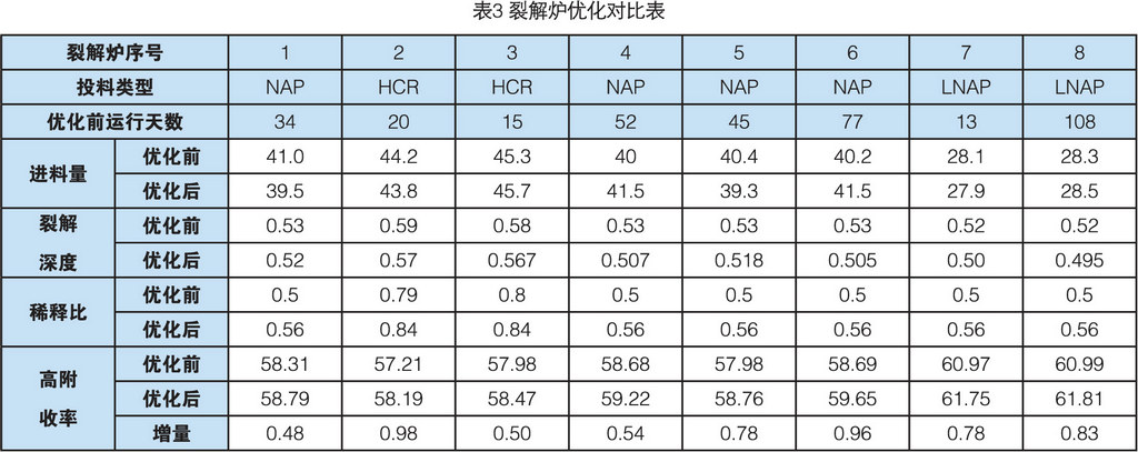 以乙烯裂解爐的操作優(yōu)化為例。該系統(tǒng)中裂解爐的優(yōu)化變量包括:裂解深度(丙烯/乙烯)、COT、稀釋比、每臺裂解爐的進(jìn)料流量。實(shí)際運(yùn)行優(yōu)化效果如下表所示,表中統(tǒng)計(jì)了裂解爐優(yōu)化前后主要優(yōu)化變量的調(diào)整情況及有代表性的高附加值產(chǎn)品的收率情況。從表中可以看出,通過對裂解深度、稀釋比等參數(shù)的優(yōu)化,裂解爐的高附加值產(chǎn)品收率平均提高了0.73%;在優(yōu)化的拉動下,受進(jìn)料總量不變的影響,高附加值產(chǎn)品收率高的裂解爐所分配的原料量有所提高,高附加值產(chǎn)品收率低的裂解爐所分配的原料量有所降低。標(biāo)定階段乙烯價(jià)格高于丙烯價(jià)格,導(dǎo)致裂解爐裂解深度(丙烯/乙烯)均向下調(diào)整,稀釋比都有不同程度的提高,也即在多產(chǎn)乙烯、丙烯的前提下,適當(dāng)提高乙烯產(chǎn)品的比例,以取得更大的效益。